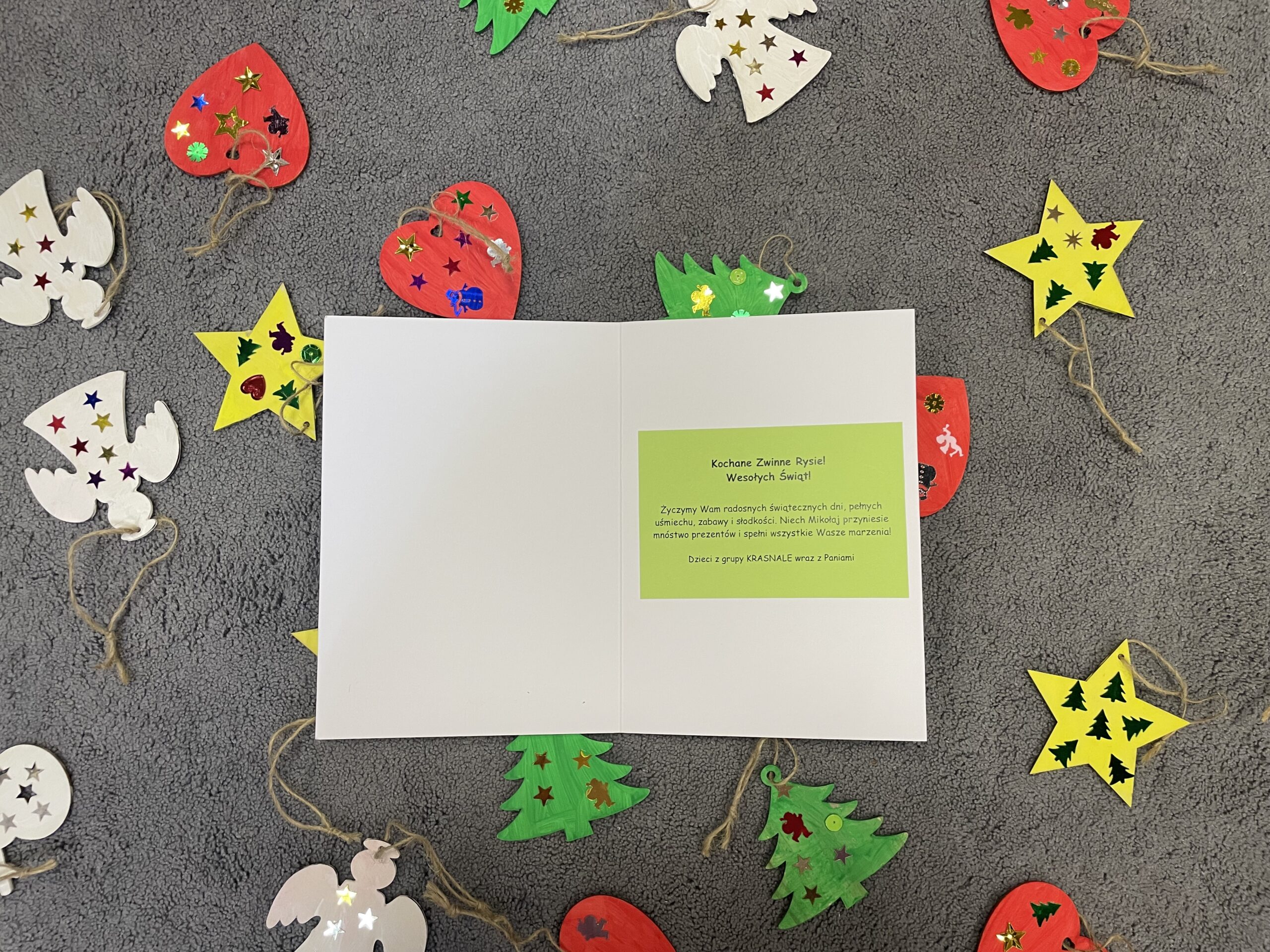Nasze przedszkole wzięło udział w wymianie świątecznych upominków z Przedszkolem Jelonek w Papowie Toruńskim. Dzieci otrzymały bombki i siateczką kartkę od grupy Krasnale. Rysie przygotowały prezent dla grupy Żabki – pachnące piernikowe bombki i świąteczną kartkę.